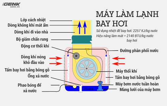 Giống như máy điều hòa không khí thông thường, máy làm lạnh bay hơi hút nhiệt bên trong tòa nhà bằng quá trình bay hơi. Tuy nhiên, việc làm lạnh được thực hiện bằng cách bay hơi nước thay vì chất làm lạnh. Dòng không khí nóng, khô được điều hòa bằng cách bơm nó qua một bể nước để nó bay hơi từ từ và làm cho dòng không khí trở nên mát hơn và ẩm hơn khi đi qua hệ thống.